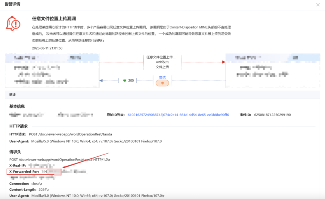 进一步对攻击和受害IP的相关告警进行分析,发现受害IP在suo5隧道通信之前,还遭受了多个来源IP的多种攻击行为,包括任意文件上传。来源IP为负载均衡,从XFF中可以看到文件上传行为来自于114.254.3.8,与suo5通信告警的源IP同C段,大概率为同一攻击队,告警时间为2023-08-11 21:01:50。查看请求体发现上传的文件名称为log.jsp,并非suo5代理通信的logs.jsp。