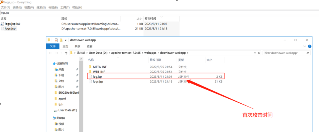 此时只能通过上机溯源,通过主机上的信息理清攻击链条。登录主机后,首先进入web目录,定位恶意文件,可以看到log.jsp和logs.jsp均存在于web目录下,说明114.XX.X.8的webshell上传成功。推断攻击者利用xx综合办公系统的任意文件上传漏洞上传天蝎webshell,再通过webshell加密上传suo5代理隧道工具,进而发起内网横向扫描。