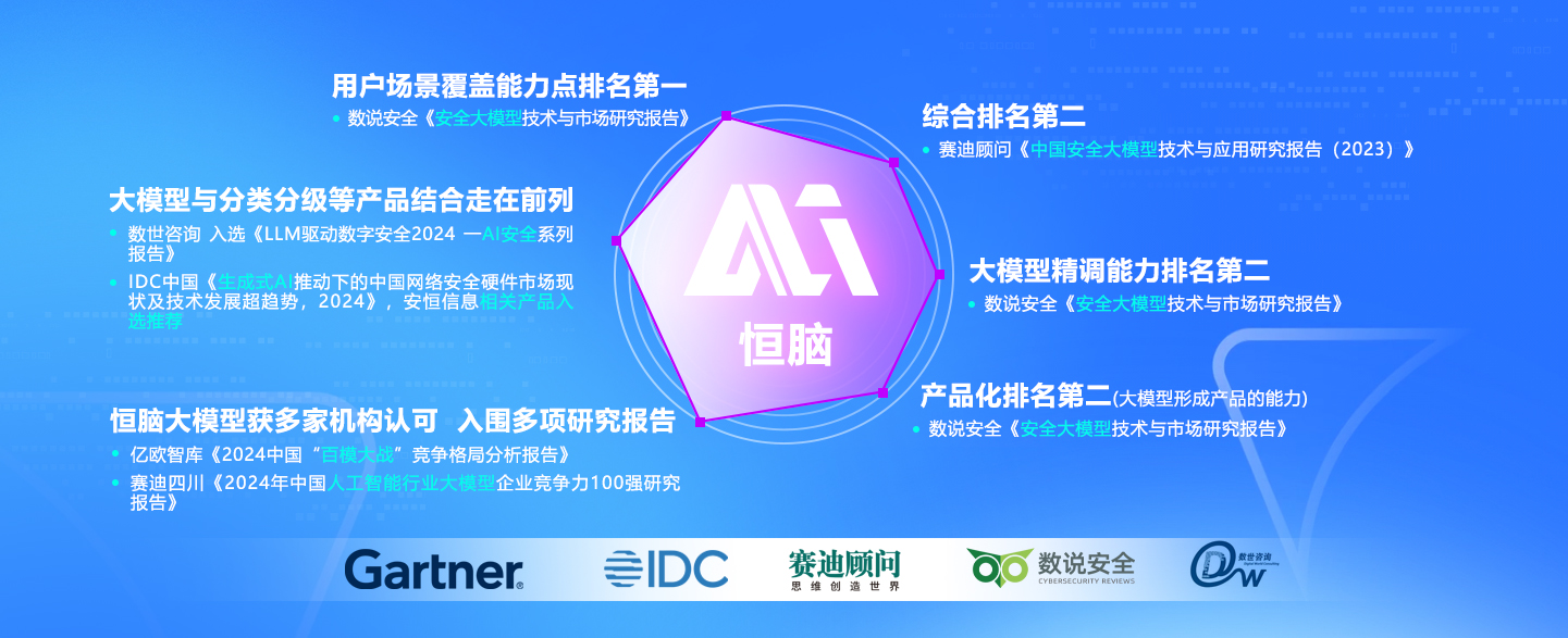 • 安恒信息将“AI”作为公司级战略,以“让安全更智能,让智能更安全”为使命,基于丰富的网络安全行业实战经验积累,孵化恒脑·安全垂域大模型系统,以大模型为底座,以智能体为核心,实现安全能力场景化调度,安全专家最佳实践规模化复制,降低安全运营门槛,提升安全运营效率,缓解安全专家短缺,助力打造更安全、更智慧的数字空间。